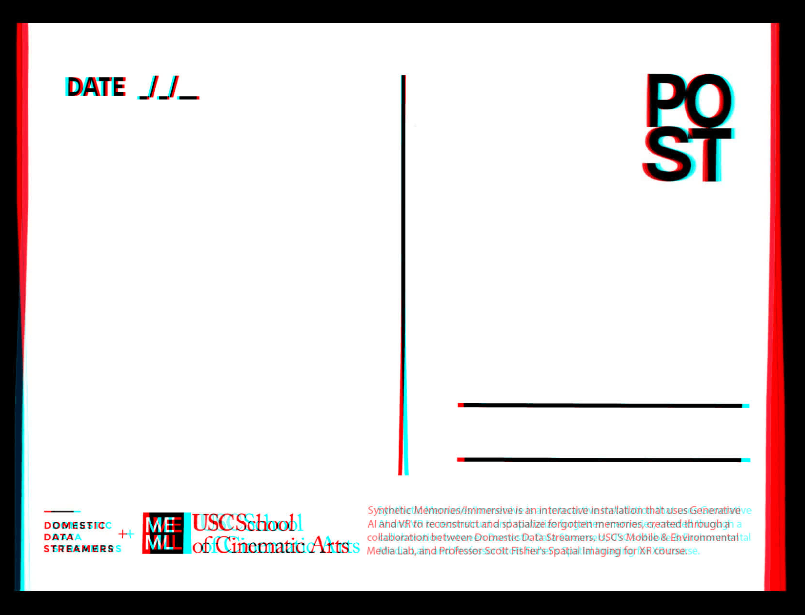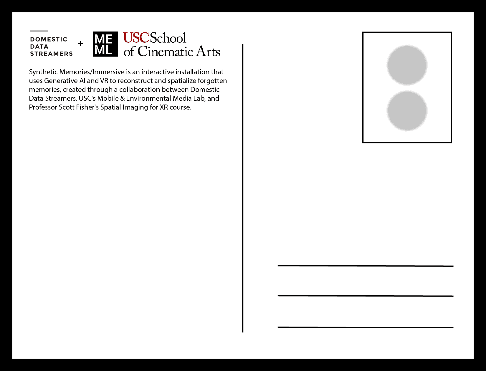 The Immersive Synthetic Memories project is a collaboration with the Synthetic Memories project by Domestic Data Streamers. Presented by the Mobile and Environment Media Lab, this project was presented as a group exhibition at the Flux Festival in the Audrey Irmas Pavillon.